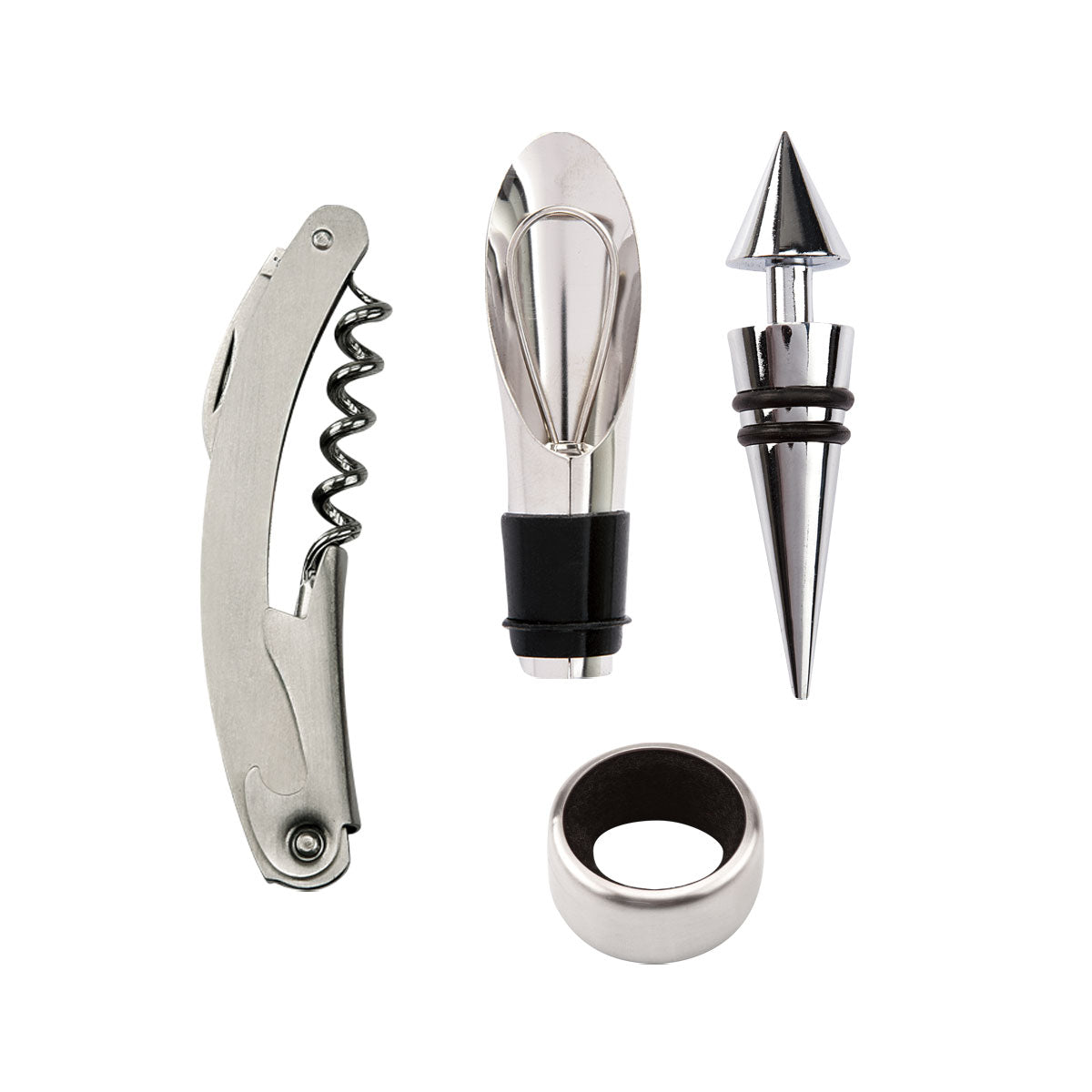 Incluye sacacorchos con navaja, stopper, boquilla y arillo. No incluye botella. Read more