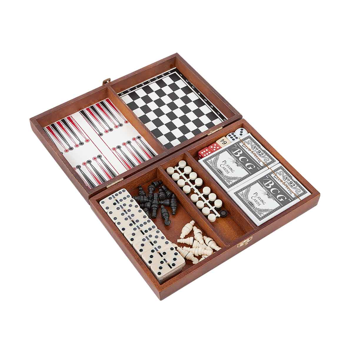 Incluye estuche de madera con juego de ajedrez, backgammon, 2 barajas plastificadas y dominó de 28 piezas. Read more