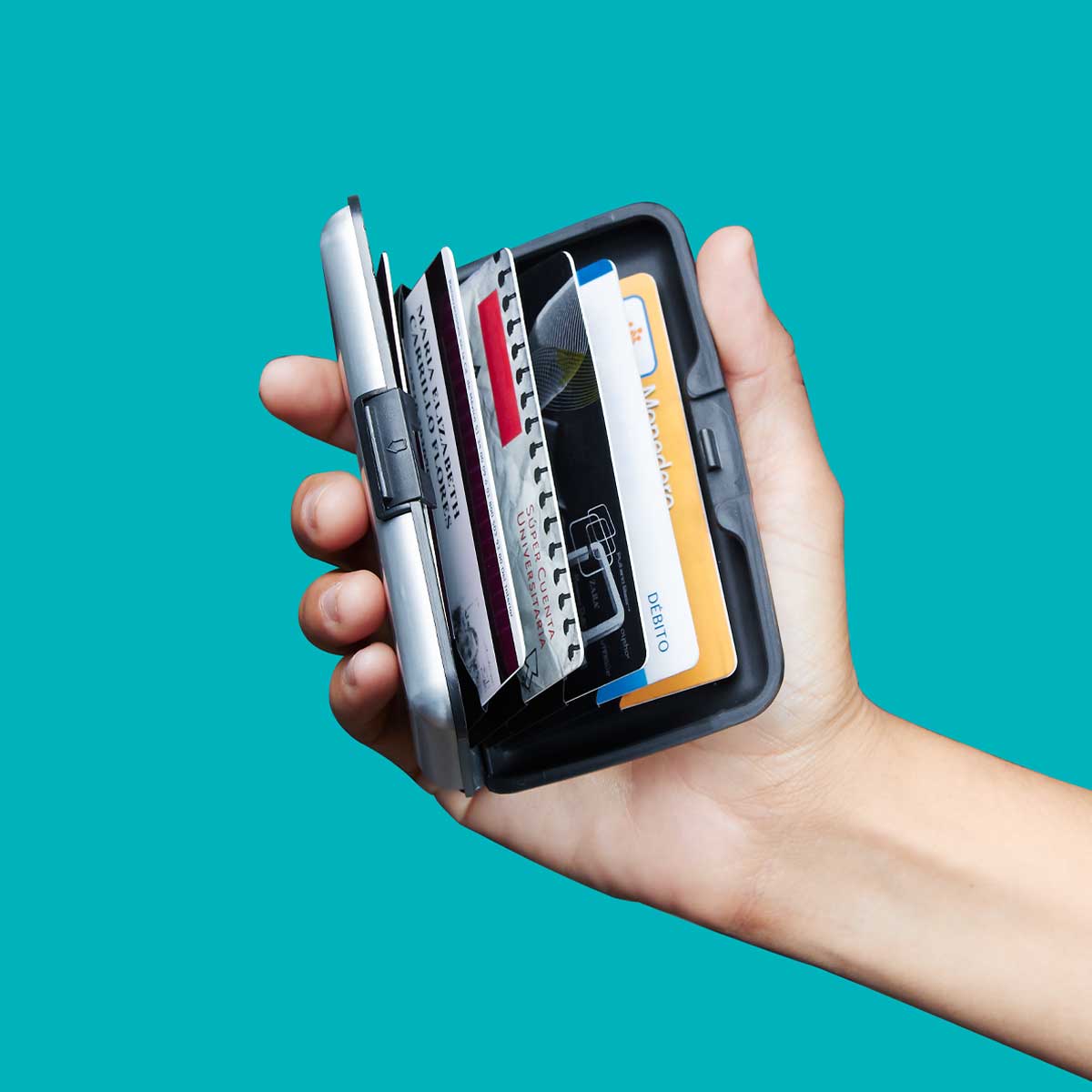 Con 6 espacios para tarjetas. Sistema anti robo RFID. Read more