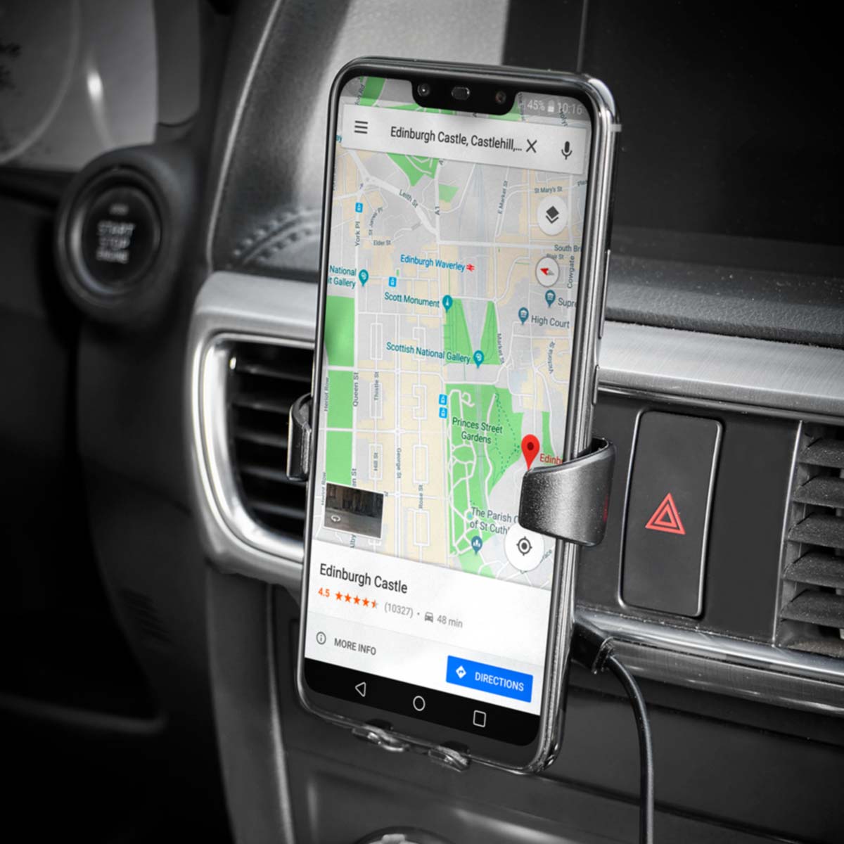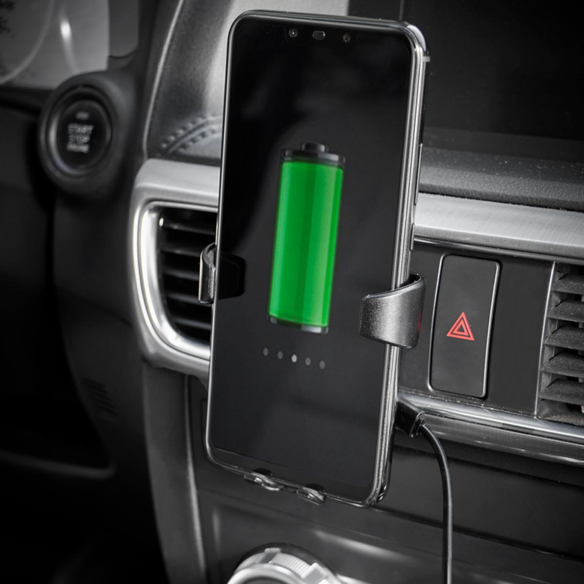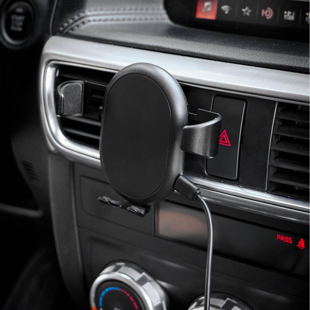 Soporte de smartphone para auto con función de carga inalámbrica. Incluye mecanismo ajustable de 7 a 10 cm de ancho.... Leer más...