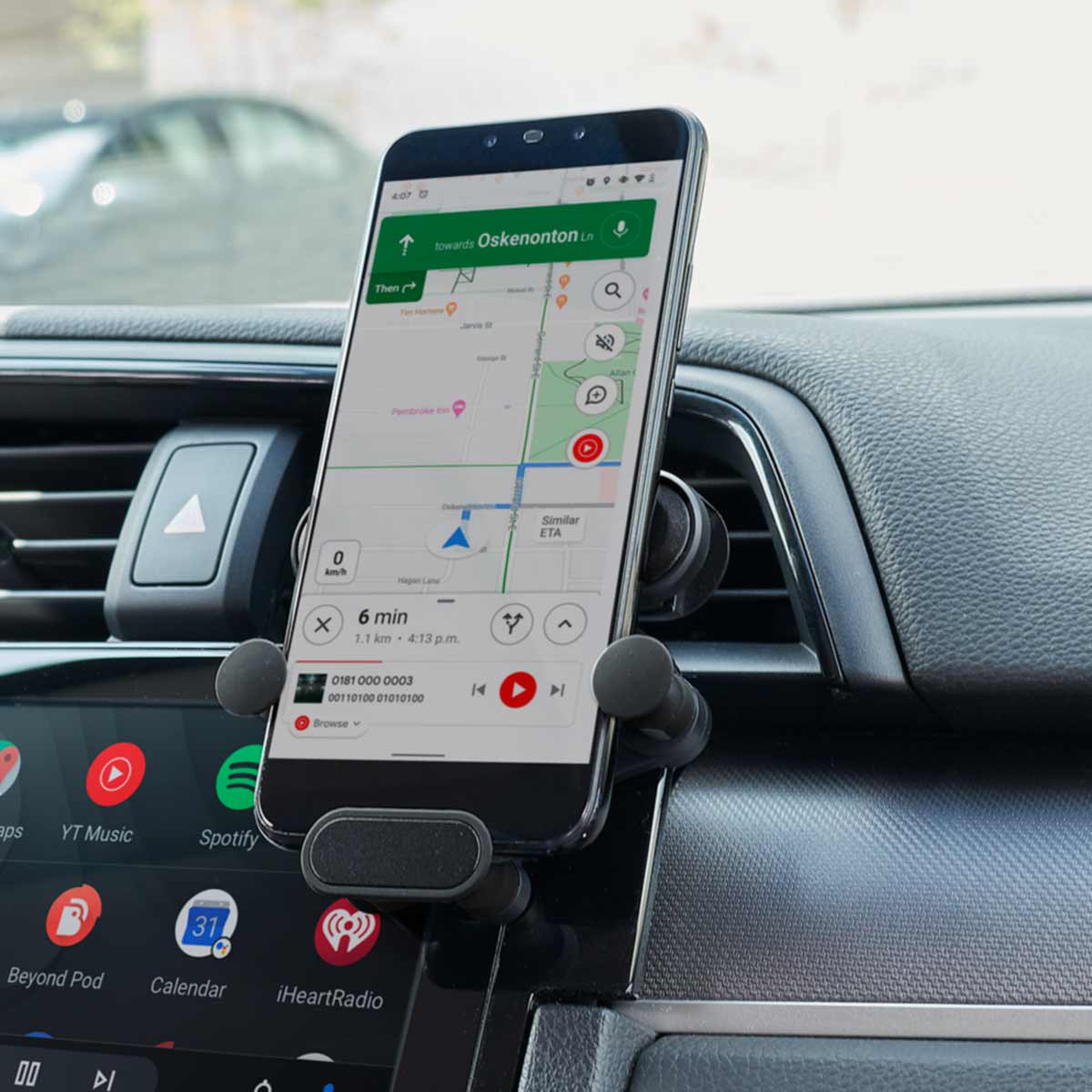 Soporte con mecanismo ajustable para smartphones. Angulo de rotación de 360°. Se monta en las ventilas del aire acondicionado. Leer más...