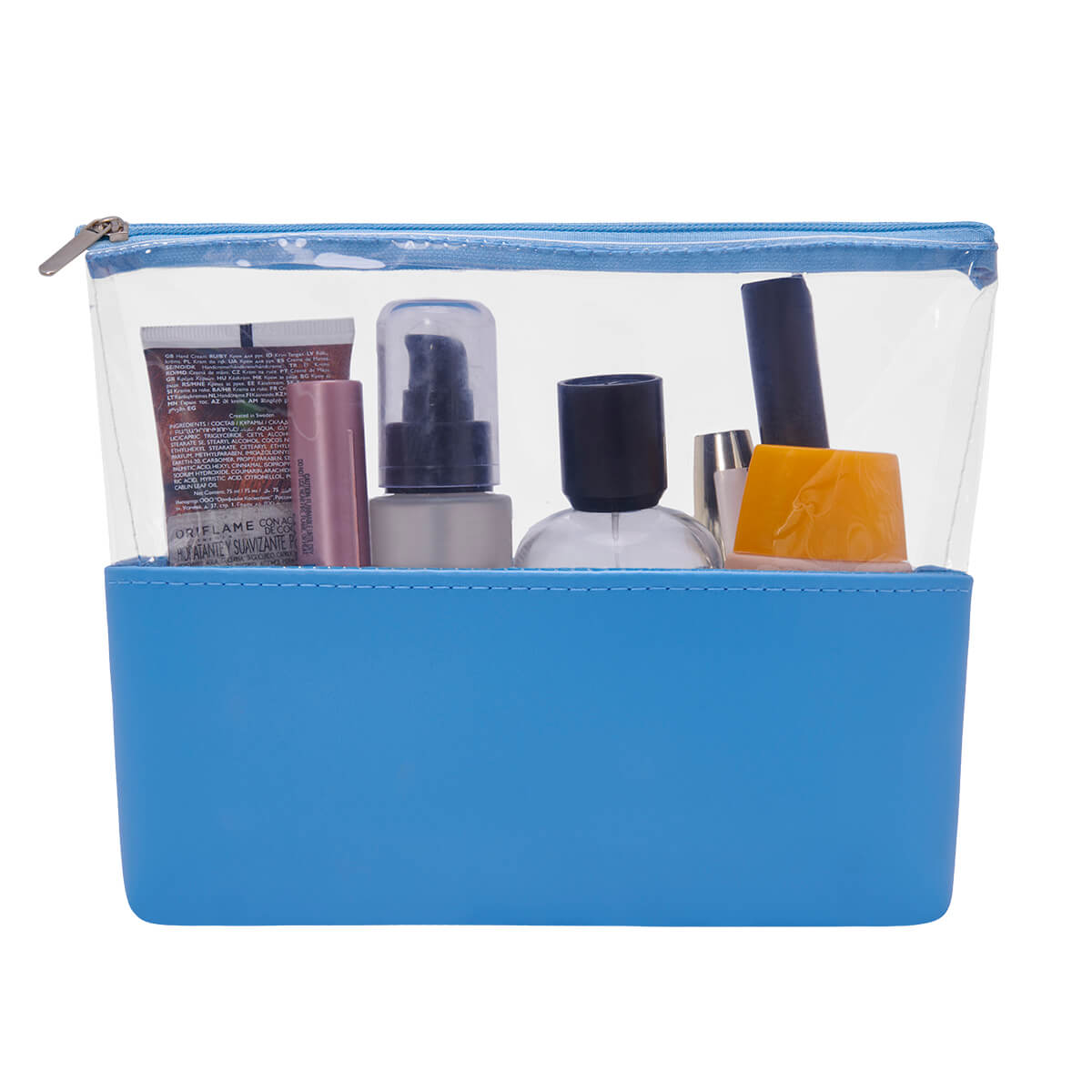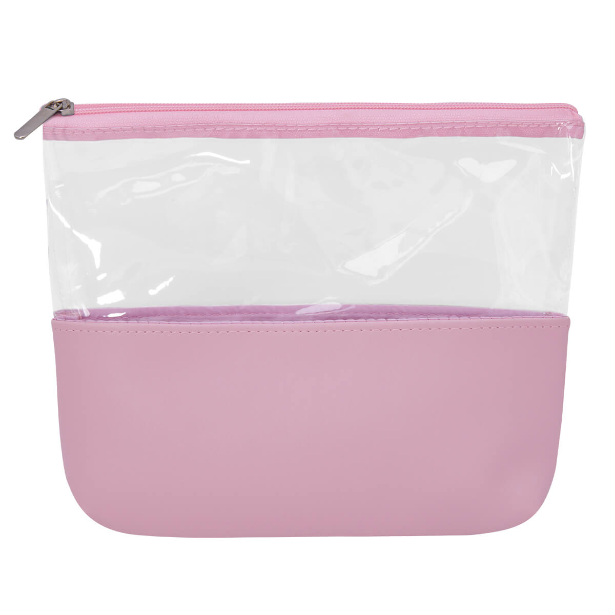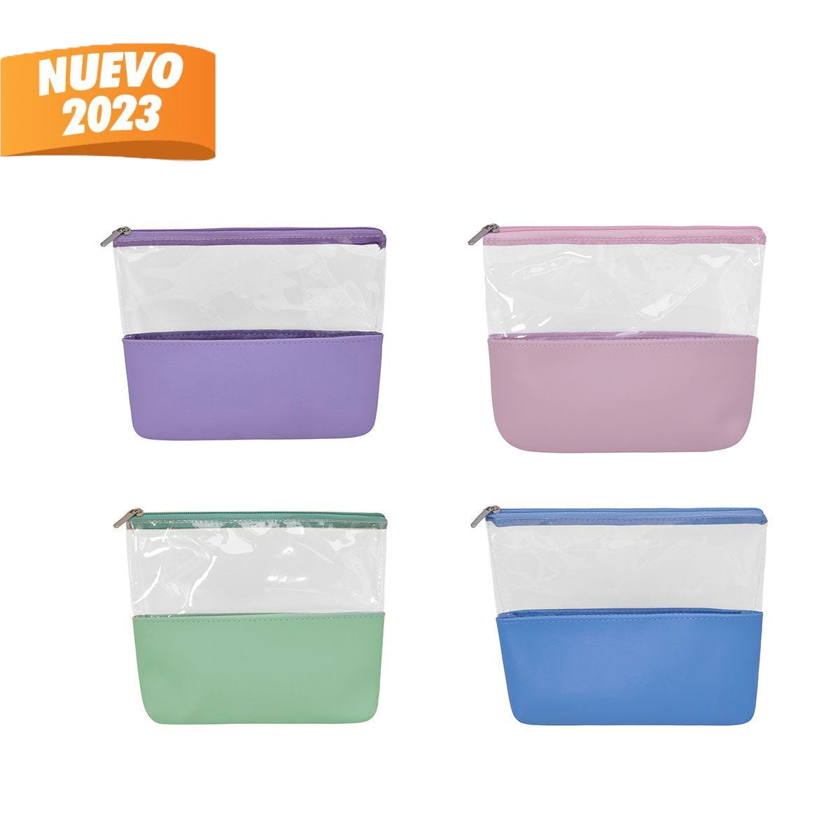Cosmetiquera con cierre. Diseño combinado de PVC transparente y curpiel de color en base. Leer más...