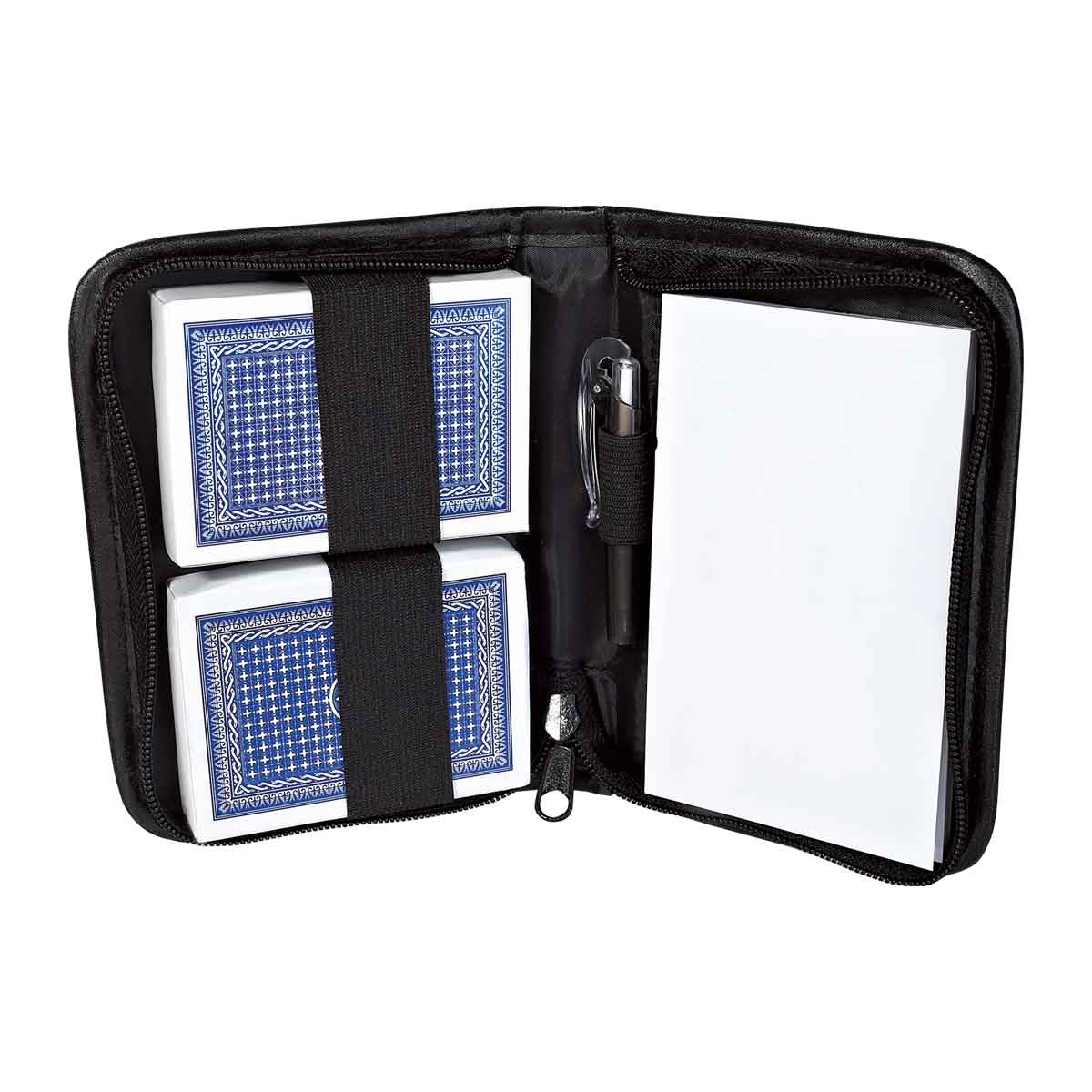 Estuche de curpiel con 2 barajas plastificadas, libreta y bolígrafo. Leer más...
