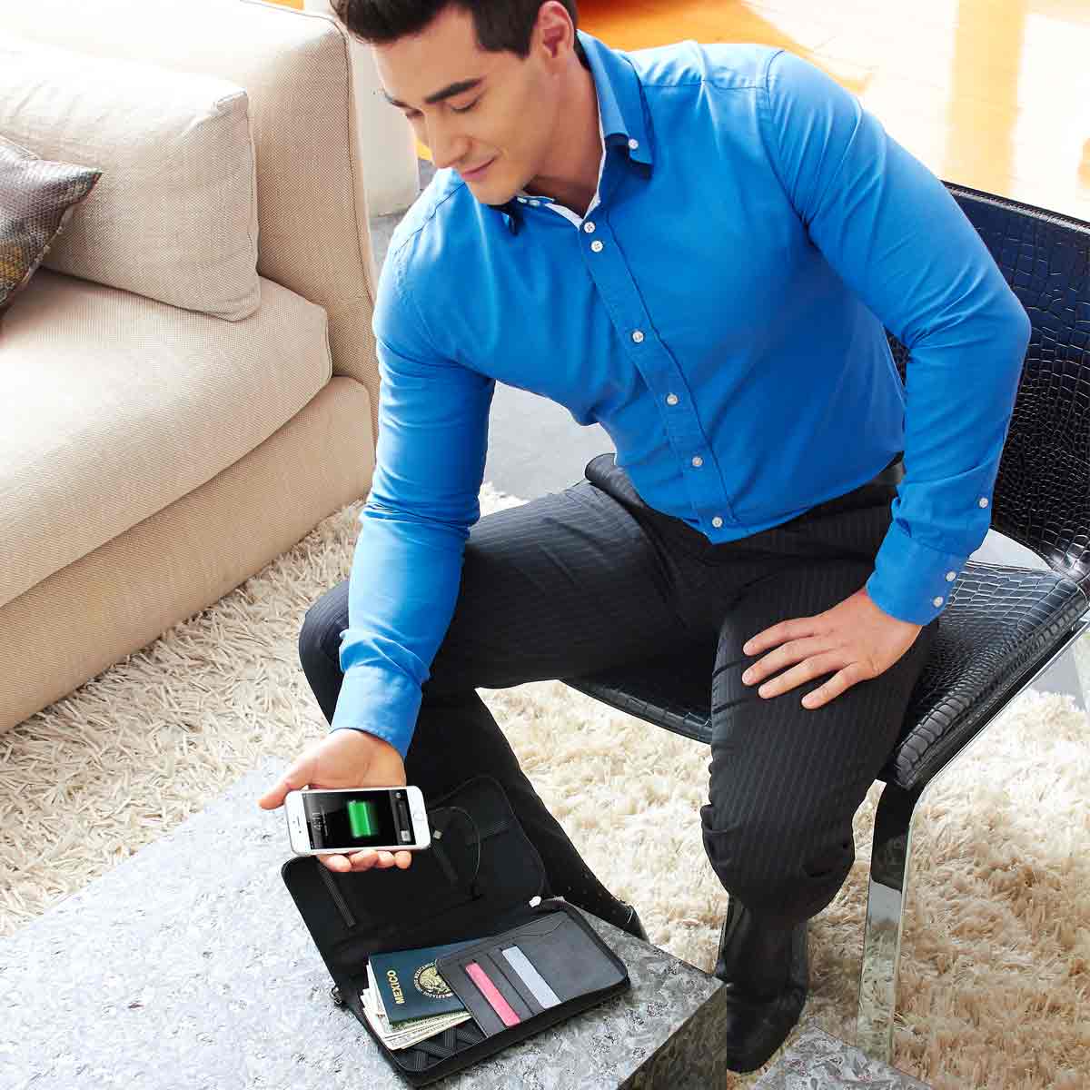 Compartimento para pasaporte, visa, boleto de avión y tarjeta de crédito. Batería auxiliar para smartphone, capacidad 4,000 mAh. Cable adaptador... Leer más...