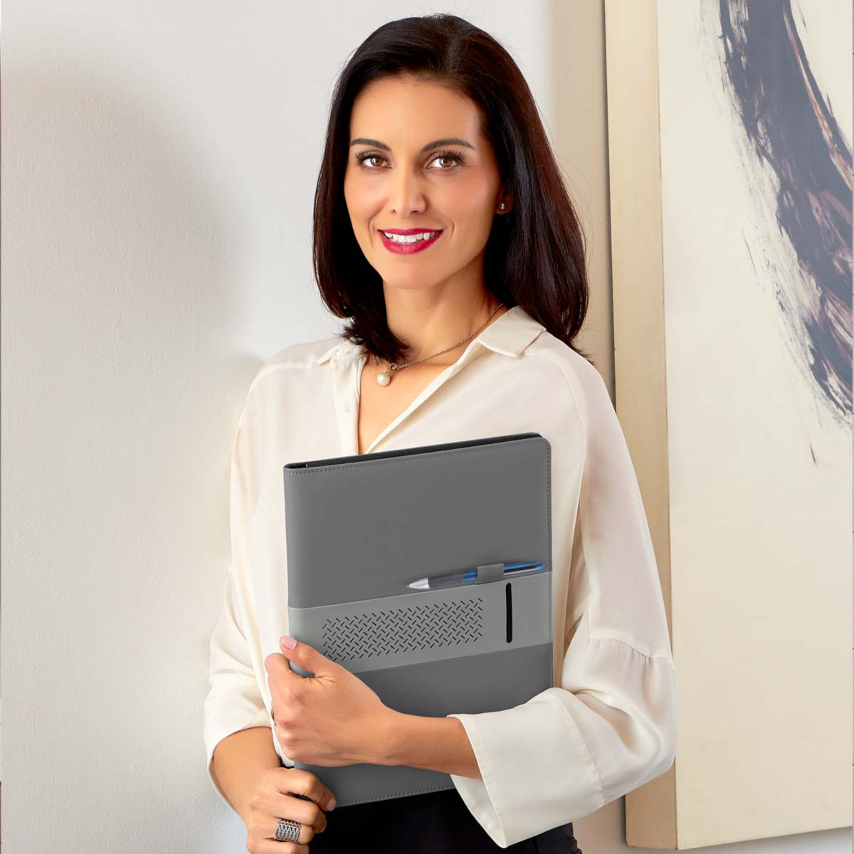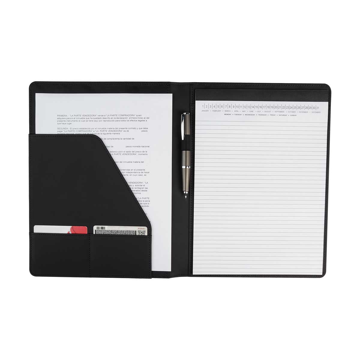 Incluye block de raya tamaño A4 con 20 hojas, elástico para bolígrafo, compartimento para documentos y tarjetas. No incluye bolígrafo. Leer más...