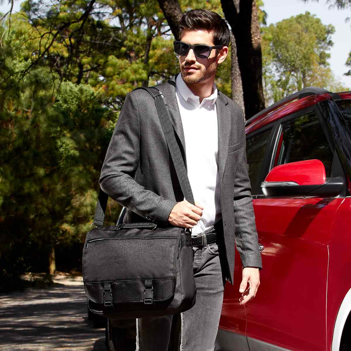 Espacio para laptop, tarjetas y documentos. Bolsa frontal con cierre y correa ajustable. Leer más...