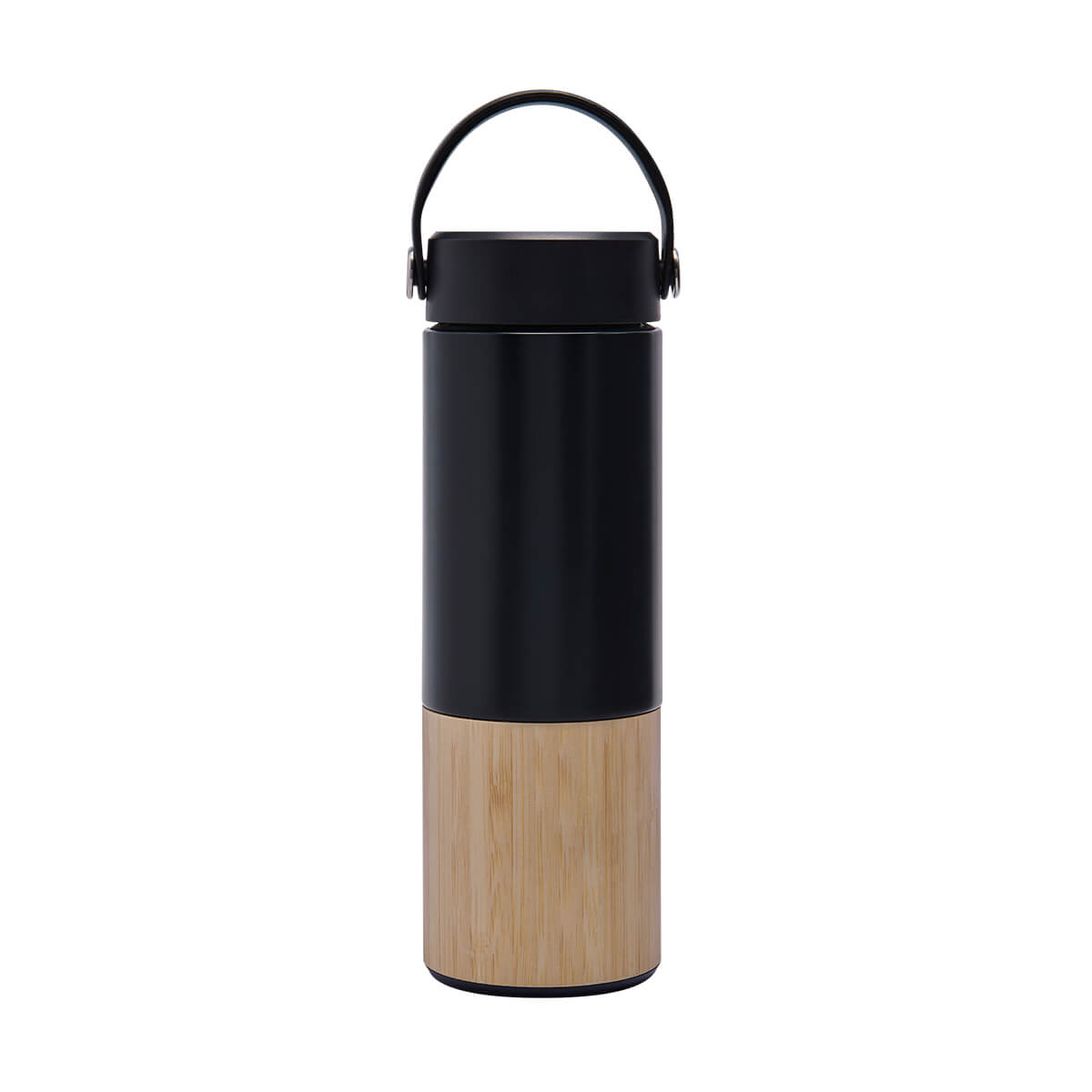 Termo doble pared con base de bambú. Cerrado al vacío. Pared interna y externa de acero inoxidable. Tapa de plástico... Leer más...